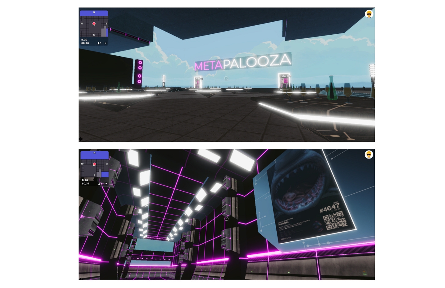 The top photo shows the Metapalooza event floor located on the second level. The lit up “Metapalooza” banner illuminates a stage, complete with a huge screen and speakers. In the lower picture, we can see the upper level, which proudly displays all of the Beeple artworks.